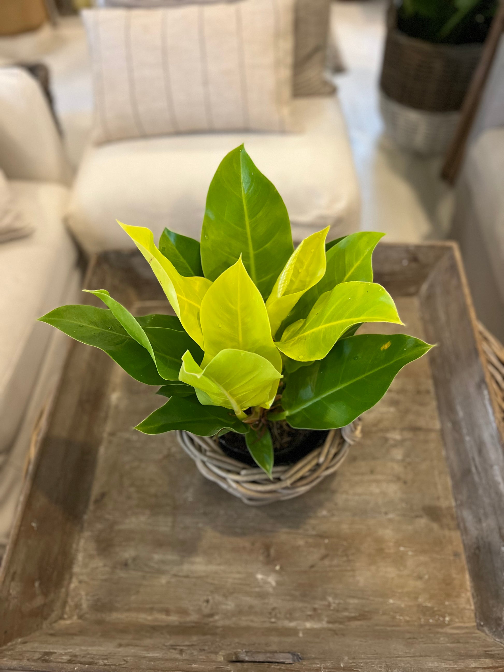 This plant is a lovely lime colour. It prefers bright, indirect light. Allow the top inch of soil to dry out between waterings.