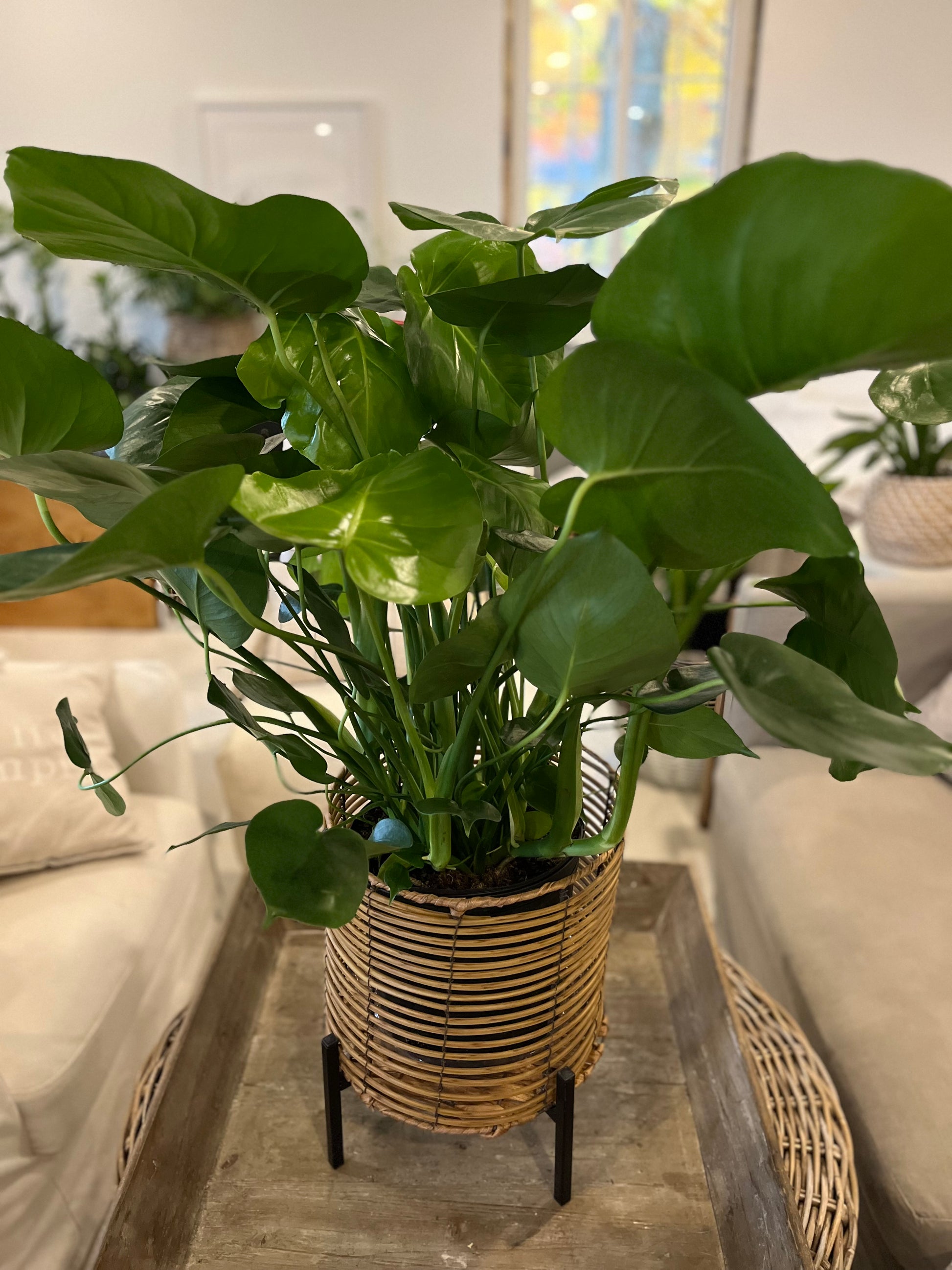 A lush full plant. This plant thrives in bright indirect light. Water regularly and let the top inch of soil completely dry out between waterings.