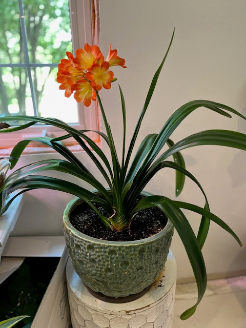 Beautiful orange flowers on this Bush Lily that is already potted in this green pot.