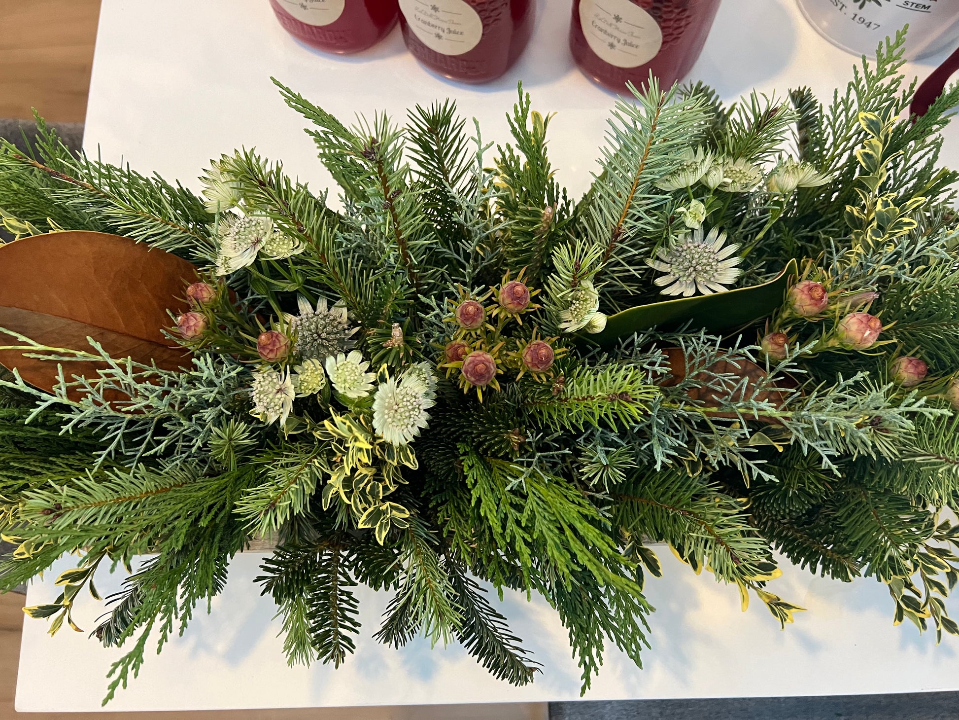 Now is the time to create an impressive winter centre piece. We have a variety of greenery and flowers to choose from. You can also bring your own container, or shop our store for one. ( sold separately).